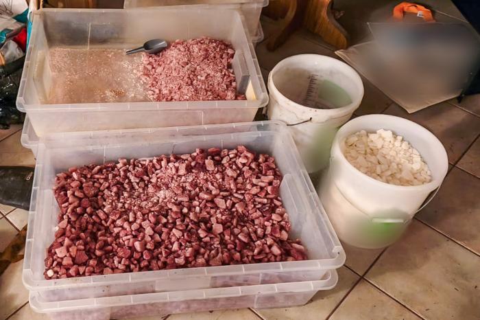 Podczas przeszukań zabezpieczono ponad 200 kilogramów klofedronu w postaci krystalicznej oraz przeszło 500 litrów tej substancji w formie płynnej. Ilości te świadczą o przemysłowym charakterze działalności.