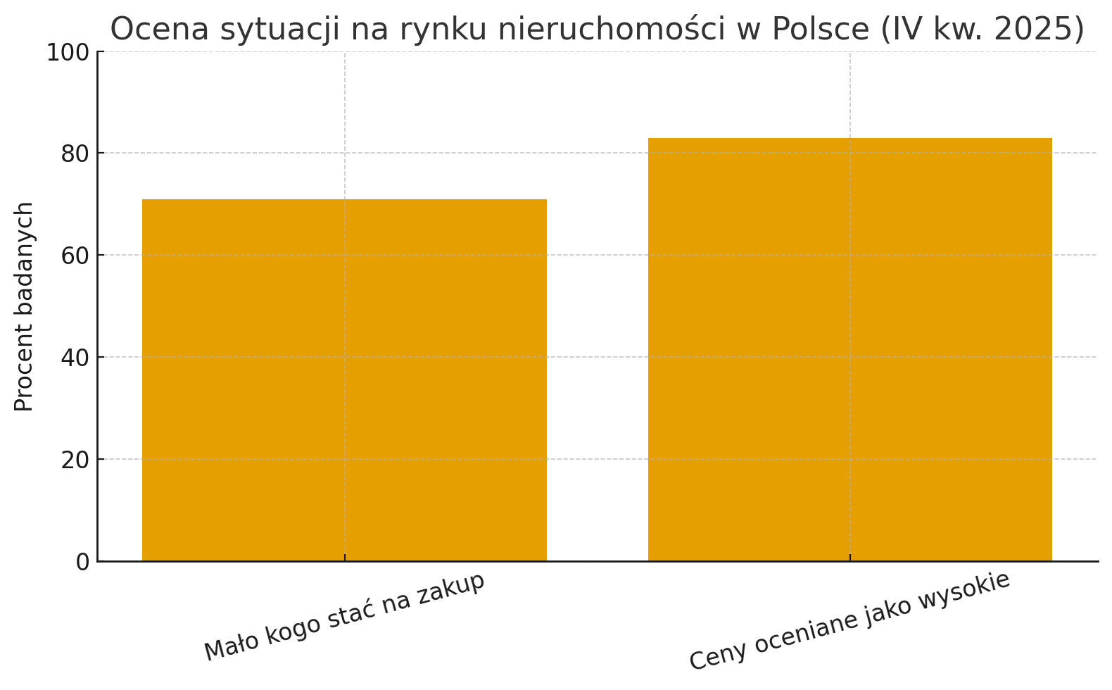 Z najnowszego raportu „To my. Polacy o nieruchomościach – IV kwartał 2025” wynika, że przeciętny obywatel nadal patrzy na rynek mieszkaniowy z dużą ostrożnością. Ponad 71 procent badanych uważa, że w ich najbliższym otoczeniu mało kto jest dziś w stanie pozwolić sobie na zakup domu lub mieszkania. To jedna z najwyższych wartości odnotowanych w ostatnich latach, mimo że rynek rzekomo zaczął sygnalizować pierwsze symptomy stabilizacji.