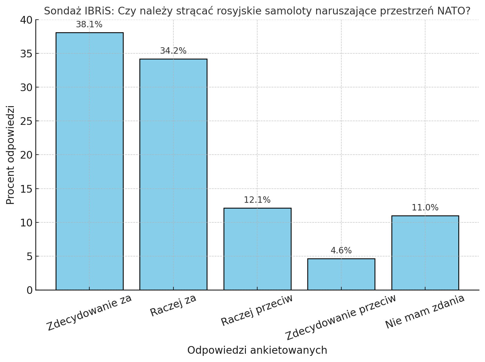 Według najnowszego badania IBRiS dla Radia ZET zdecydowana większość Polaków uważa, że rosyjskie samoloty naruszające przestrzeń powietrzną NATO powinny być zestrzeliwane. Aż 72,3 proc. respondentów popiera takie rozwiązanie, a najwięcej zwolenników strącania intruzów znalazło się wśród wyborców Lewicy.