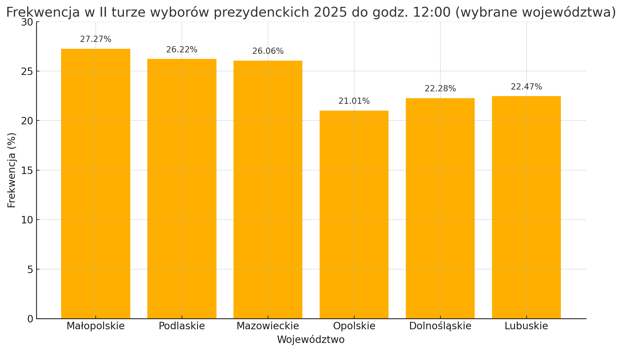 Według danych przedstawionych przez przewodniczącego Państwowej Komisji Wyborczej Sylwestra Marciniaka, do godziny 12:00 najwyższą frekwencję w II turze wyborów prezydenckich 2025 odnotowano w województwie małopolskim – 27,27 proc. Tuż za nim uplasowało się woj. podlaskie (26,22 proc.) oraz mazowieckie (26,06 proc.).