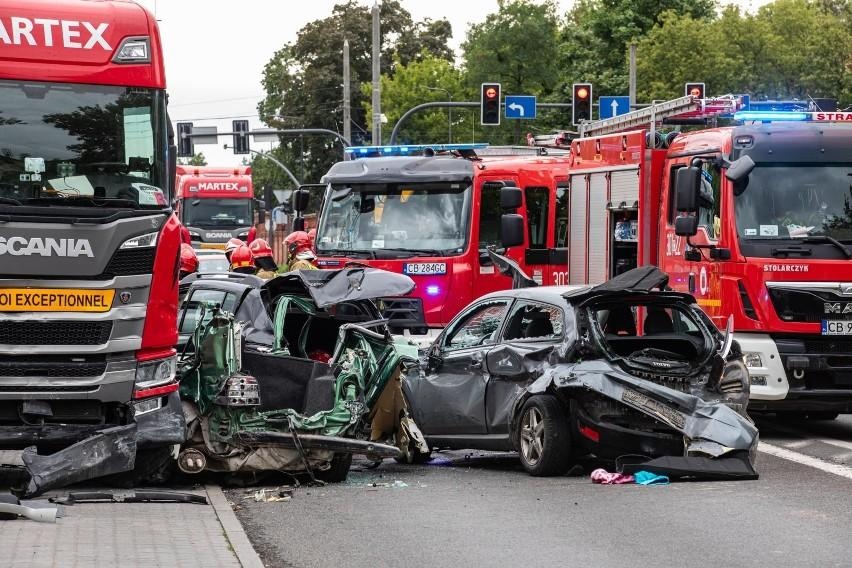 Karambol w Bydgoszczy - tir zmiótł 9 samochodów. Do tragedii doszło w poniedziałek po południu na ruchliwym skrzyżowaniu ulic Kamiennej i Gdańskiej w Bydgoszczy. Według informacji ze źródeł strażackich, karambol wywołało zderzenie dziewięciu aut osobowych i dwóch ciężarówek. Nagranie opublikowane na profilu społecznościowym "Bydgoszcz 998" pokazuje chwilę zderzenia, kiedy to czerwona ciężarówka rusza spod świateł i taranuje stojące na przeciwnym skrzyżowaniu pojazdy. W wyniku zderzenia obrażeń doznało 12 osób, z czego sześć zostało przewiezionych do miejscowych szpitali.