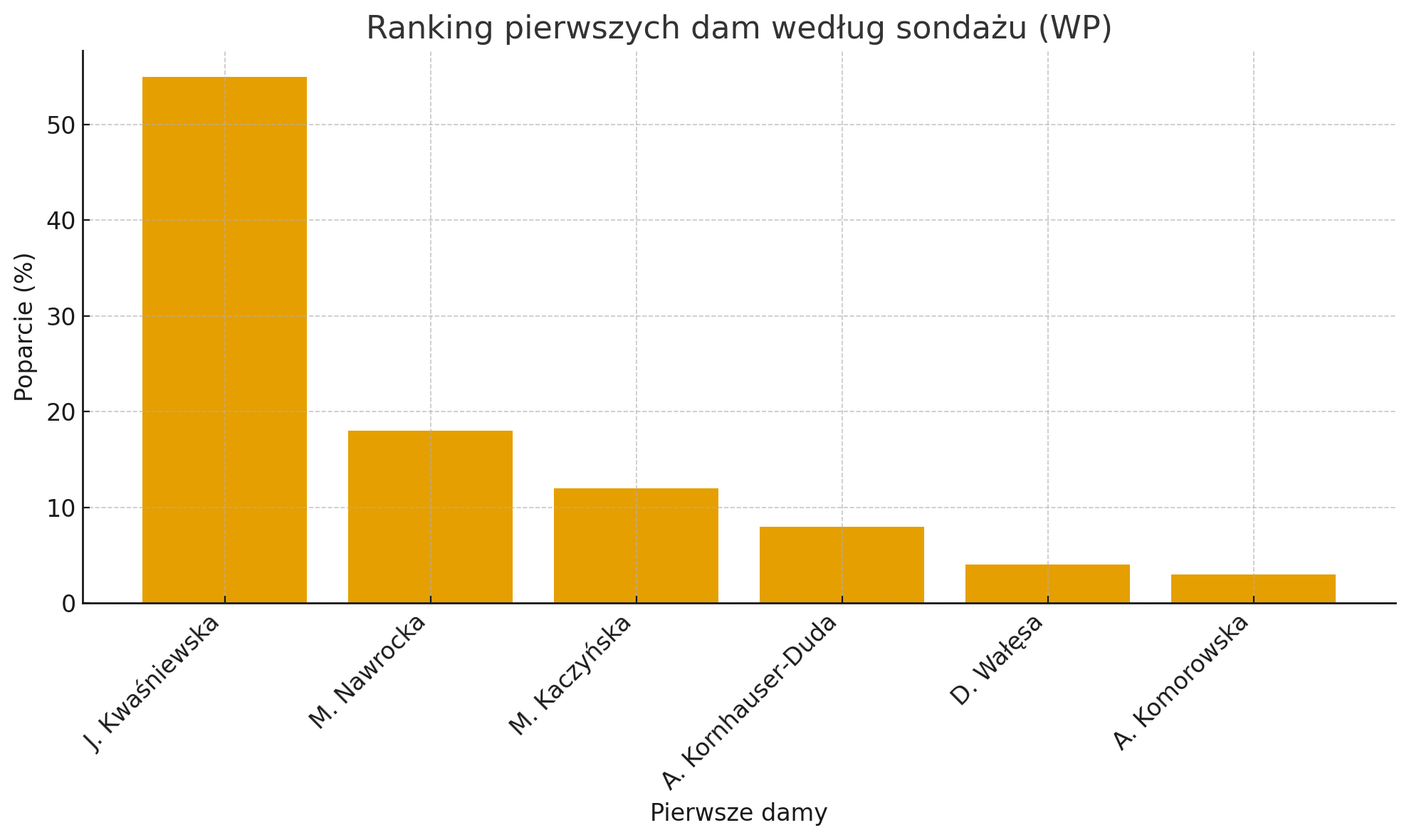 Zdecydowaną liderką została Jolanta Kwaśniewska, która pełniła tę funkcję w latach 1995–2005. Aż 55 proc. respondentów uznało, że to właśnie ona najlepiej wypełniała obowiązki pierwszej damy, wyprzedzając wszystkie inne kandydatki z ogromnym zapasem. Jej aktywność społeczna, styl oraz medialna rozpoznawalność sprawiają, że od lat cieszy się najwyższym uznaniem społecznym.