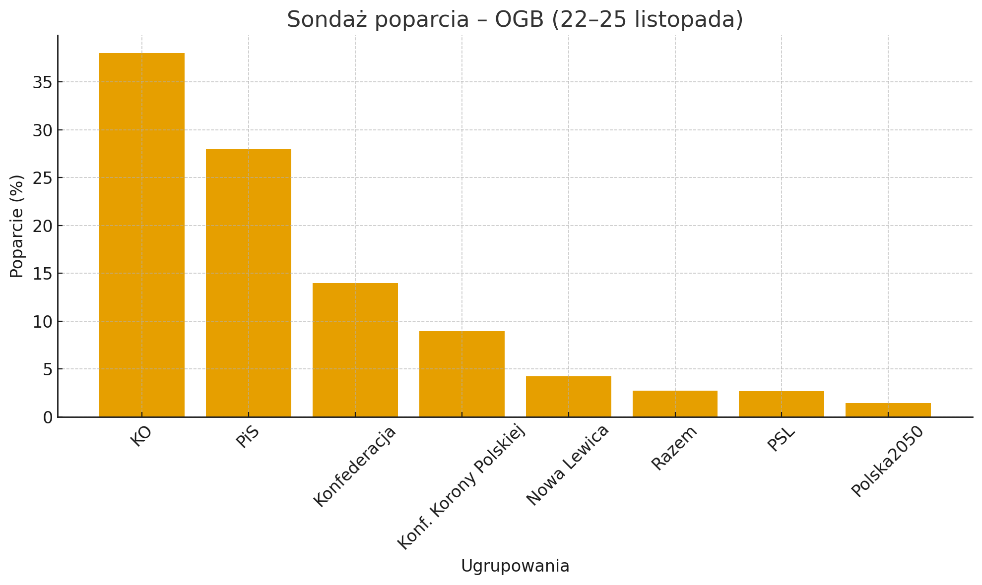 Sondaż OGB zrealizowano metodą CATI, czyli wywiadów telefonicznych, na reprezentatywnej grupie 1000 respondentów w dniach 22–25 listopada. To jedno z regularnie publikowanych badań tego ośrodka, które od kilku miesięcy konsekwentnie pokazują podobny układ sił.