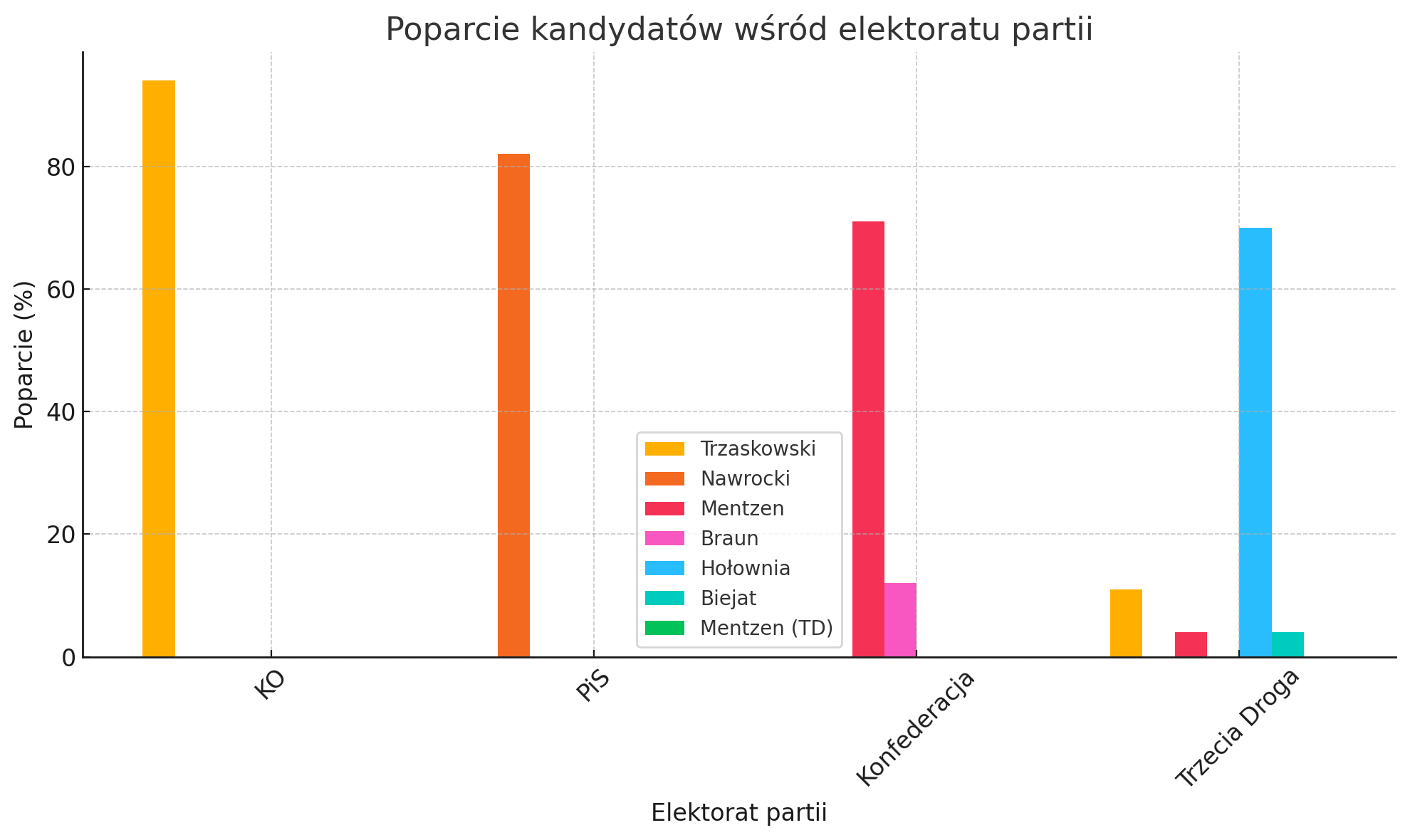 Sondaż analizuje także preferencje wyborcze zwolenników poszczególnych partii. Wśród wyborców Koalicji Obywatelskiej aż 94 proc. deklaruje poparcie dla Trzaskowskiego, podczas gdy 82 proc. sympatyków PiS-u wskazuje na Karola Nawrockiego. Sławomir Mentzen jest wyborem 71 proc. wyborców Konfederacji, a co ósmy zwolennik tej partii (12 proc.) woli Grzegorza Brauna.