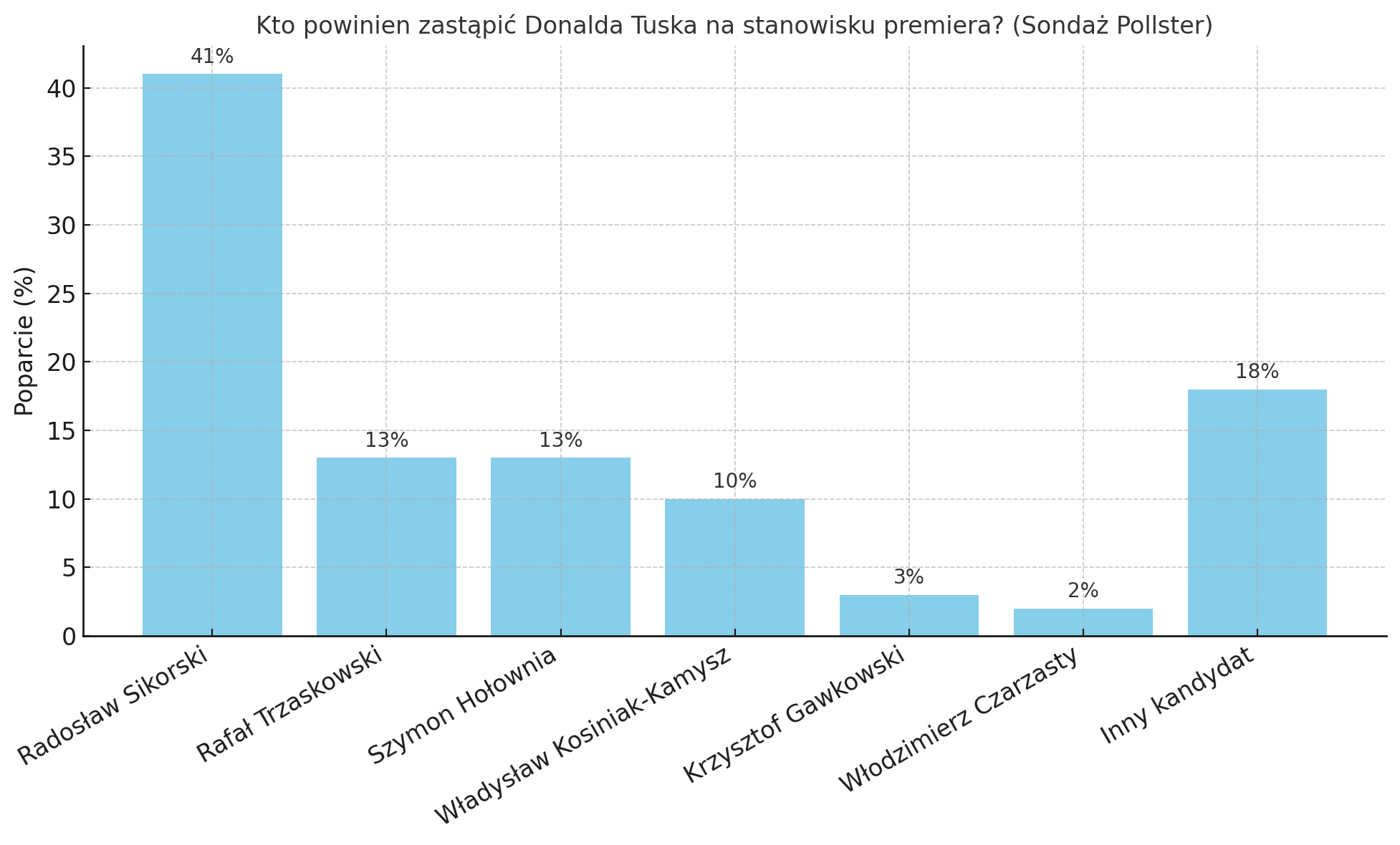 W sondażu Pollster zapytano respondentów, kto powinien przejąć funkcję premiera, gdyby Donald Tusk ustąpił ze stanowiska. 41 proc. badanych wskazało na Radosława Sikorskiego.