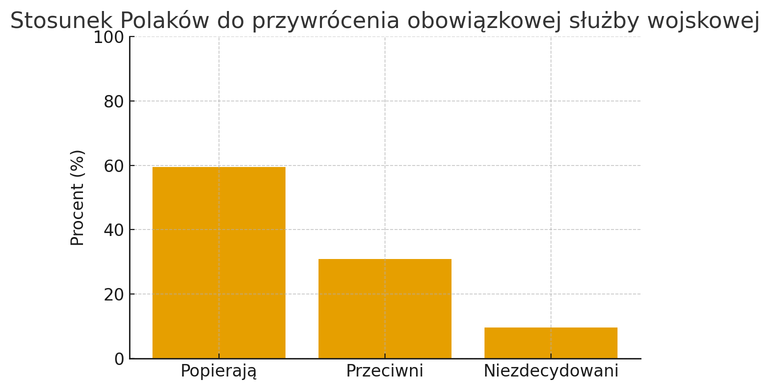 Najświeższe dane z badania United Surveys dla Wirtualnej Polski pokazują wyraźny wzrost poparcia społeczeństwa dla przywrócenia obowiązkowej zasadniczej służby wojskowej. W obliczu niestabilnej sytuacji międzynarodowej aż 59,4 proc. Polaków opowiada się za powrotem poboru, podczas gdy sprzeciw wyraża 30,9 proc. ankietowanych.