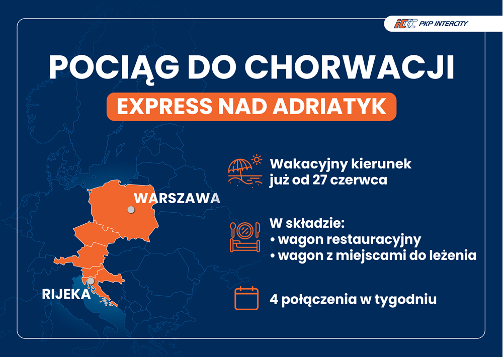 PKP Intercity oficjalnie zapowiedziało długo oczekiwane połączenie kolejowe z Warszawy do Chorwacji. Pociąg będzie kursował w wakacje, łącząc stolicę Polski z Rijeką – popularnym celem letnich podróży. Pierwszy skład wyruszy 27 czerwca 2024 roku i będzie kursował cztery razy w tygodniu – we wtorki, czwartki, piątki i niedziele.