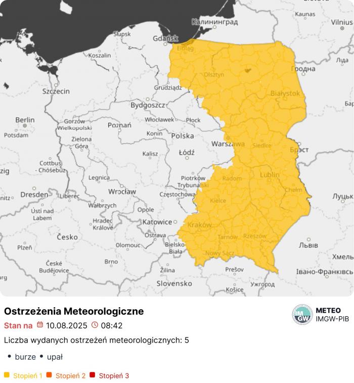 Noc będzie w większości kraju pogodna, z zachmurzeniem małym i umiarkowanym. Jedynie na północy i wschodzie możliwe przelotne opady deszczu, a na krańcach wschodnich – początkowo także burze. Na Podkarpaciu mogą wystąpić poranne mgły ograniczające widzialność do 500 metrów.