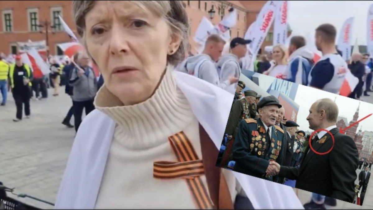 Starsza kobieta, uczestnicząca w manifestacji, miała na sobie rosyjski symbol – wstążkę św. Jerzego, jednocześnie była owinięta polską flagą.