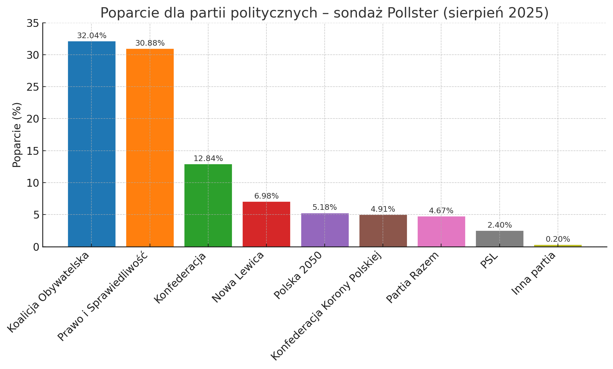 Z najnowszego badania Instytutu Badań Pollster dla „Super Expressu” wynika, że Koalicja Obywatelska zdobywa obecnie 32,04 proc. poparcia, wyprzedzając Prawo i Sprawiedliwość, które może liczyć na 30,88 proc. Wyniki pokazują wyraźną zmianę w układzie sił politycznych, szczególnie w porównaniu z początkiem lipca, kiedy to PiS utrzymywało przewagę.