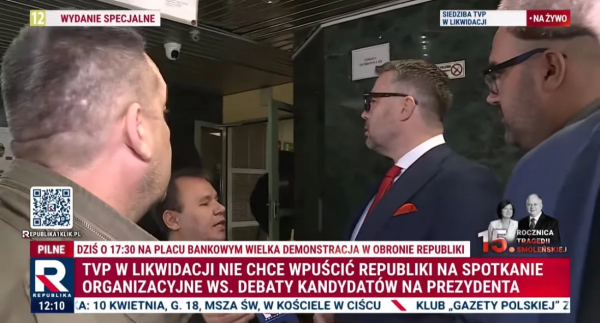 W czwartek, 10 kwietnia 2025 roku, w siedzibie Telewizji Polskiej przy ulicy Woronicza w Warszawie odbyło się spotkanie przedstawicieli sztabów wyborczych Rafała Trzaskowskiego i Karola Nawrockiego. Celem rozmów była organizacja planowanej na 11 kwietnia debaty prezydenckiej w Końskich (województwo świętokrzyskie). Do siedziby TVP siłowo próbują wedrzeć się pracownicy T Republika i telewizji wPolsce.