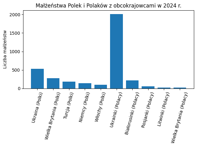 Wykres słupkowy, który pokazuje liczbę małżeństw Polek i Polaków z obcokrajowcami w 2024 roku, z podziałem na najczęstsze narodowości.