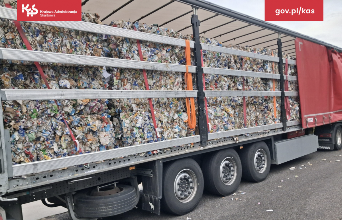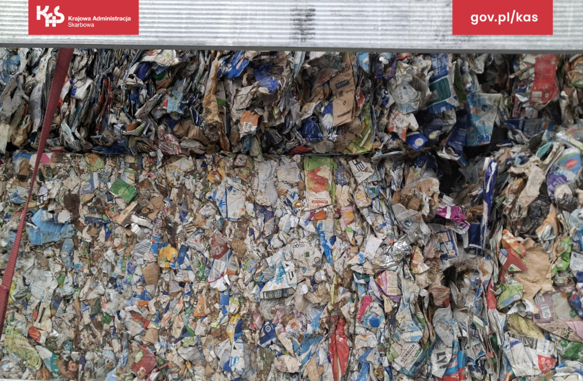 Galeria zdjęć przedstawia zatrzymany transport odpadów, które nie były wymienione w unijnym wykazie. Kierowca podał, że towar to papier i tektura, jednak rewizja wykazała inaczej: plastikowe nakrętki, kartony, foliowe worki, folia aluminium i materiały tekstylne. Odpady były sprasowane i spięte drutem, erształt, który miał uniemożliwić ich identyfikację. Analiza wykazała, że są to odpady spoza unijnej listy, co stwarza zagrożenie dla środowiska. Transport został zabezpieczony, a dalsze postępowanie prowadzi Główny Inspektorat Ochrony Środowiska w celu zabezpieczenia Polski przed nielegalnym importem odpadów.