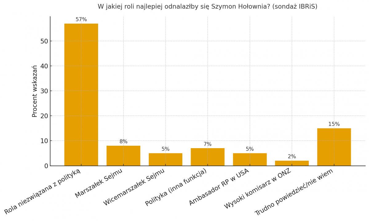 Ponad połowa Polaków widzi Hołownię poza światem polityki, a niektórzy woleliby go nawet jako ambasadora w USA bądź wysokiego komisarza w ONZ. Badanie pokazuje zróżnicowane zdania i wskazuje na poparcie dla obecnego stanowiska marszałka Sejmu oraz perspektywę w działalności medialnej czy międzynarodowej. Wyniki sondażu pokazują, że dla części społeczeństwa wizerunek Hołowni w mediach i niezależności od polityki są ważniejsze niż jego funkcja polityczna.